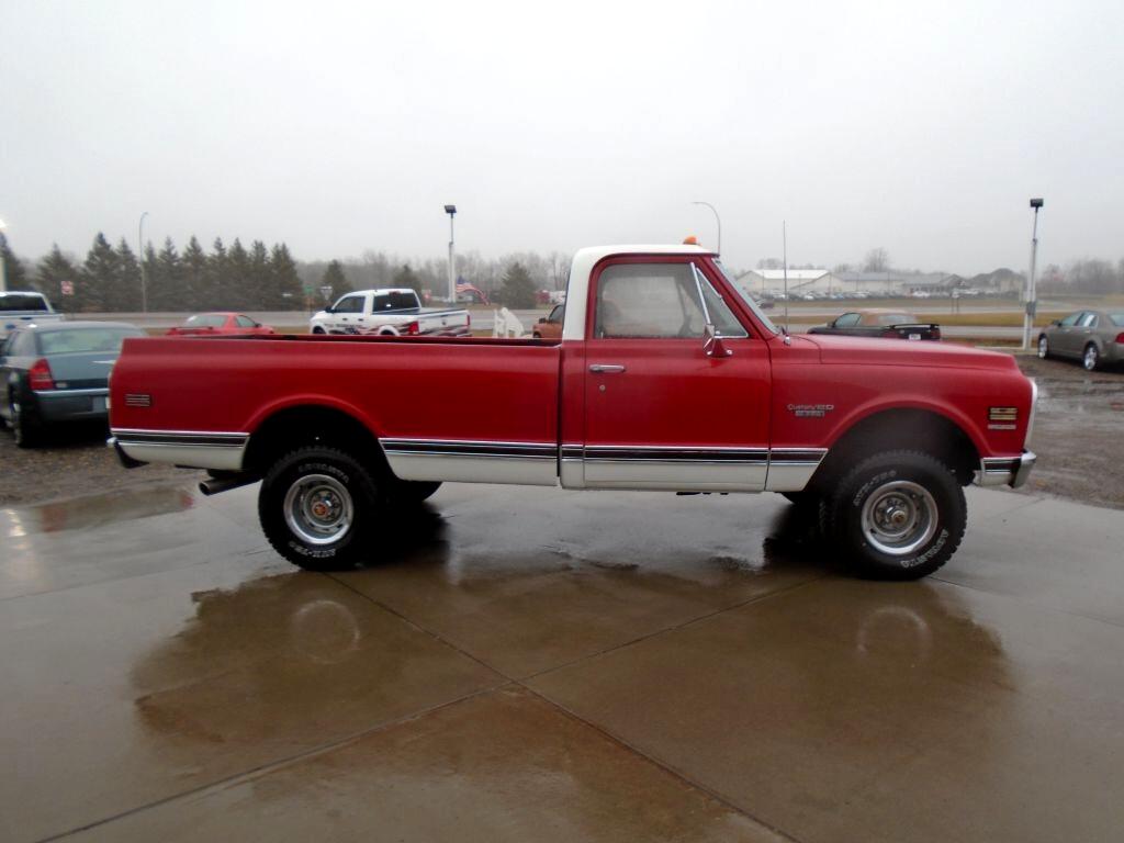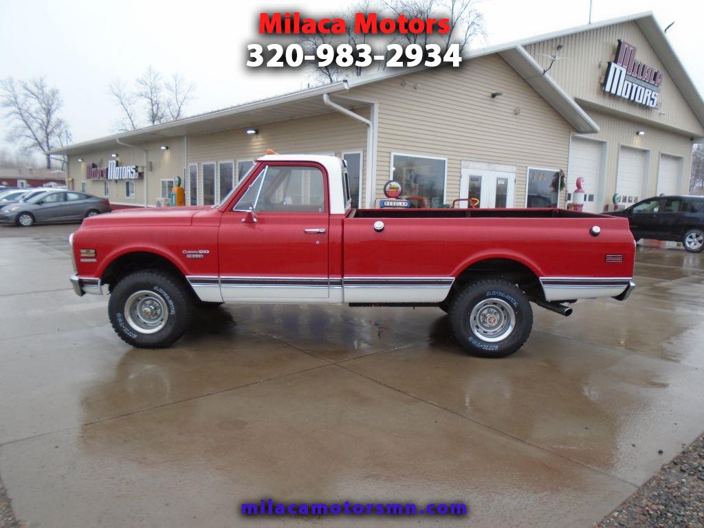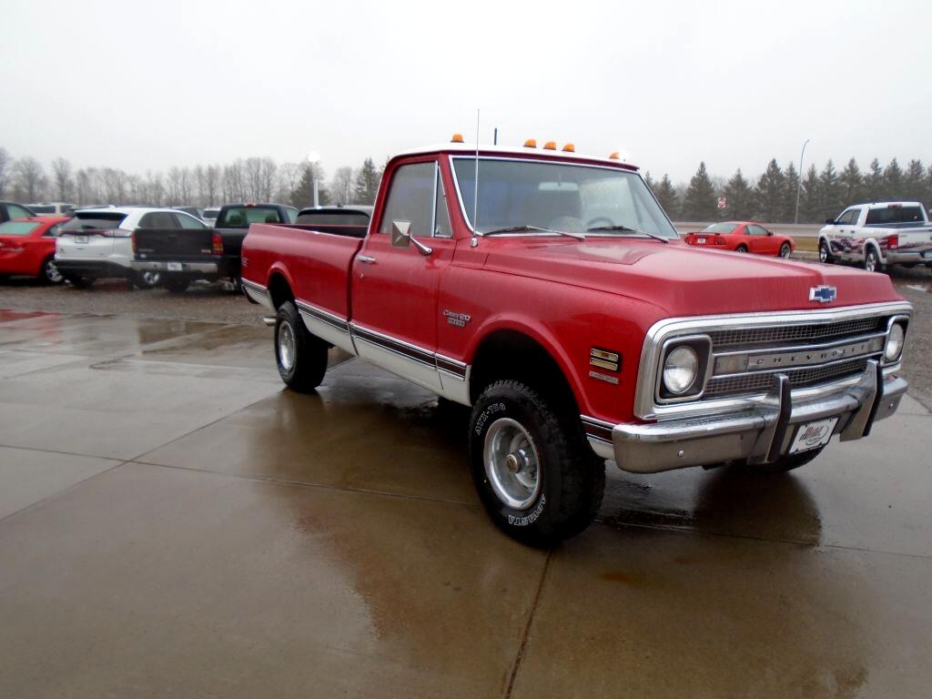 Meet an oldie and maybe even a collector! Our 1970 Chevrolet C20 Regular Cab 4X4, shown off in a Flame Red paint earned the success and prestige to spawn today's Silverado. Powered by a chrome dressed-up 396 CID V8 that is tied to an Manual transmission. Step back in time where the Chevrolet Badge is bold and simple. To a time where true chrome molding to show its bold clean lines. Chrome bumpers were also an up-sell item as well as the custom wheels, dual pipes, and special lined bed. This C20 is an amazing find! Would you believe that standard features included for this year were, vinyl seating, panoramic rear window, padded dash, heater/defroster, padded sun visors, low-profile control knobs, safety glass, windshield wipers, windshield defrosters, low profile steering wheel, directional signals, and more. Notice the upgraded seating, stereo, gauges, and simplicity as a reminder of simple times where a vehicle was to take you from point A to point B and return. This really is a nice truck and you need to see it to believe it. Solid American Steel void of airbags, ABS, or Bluetooth designed to be solid and durable. This is a truck lovers truck! Print this page and call us NOW...We Know you Will Enjoy Your Test Drive Towards Ownership!